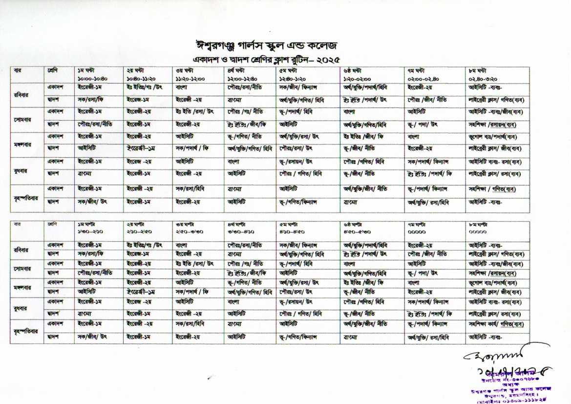 একাদশ ও দ্বাদশ শ্রেণির ক্লাস রুটিন- ২০২৫ |